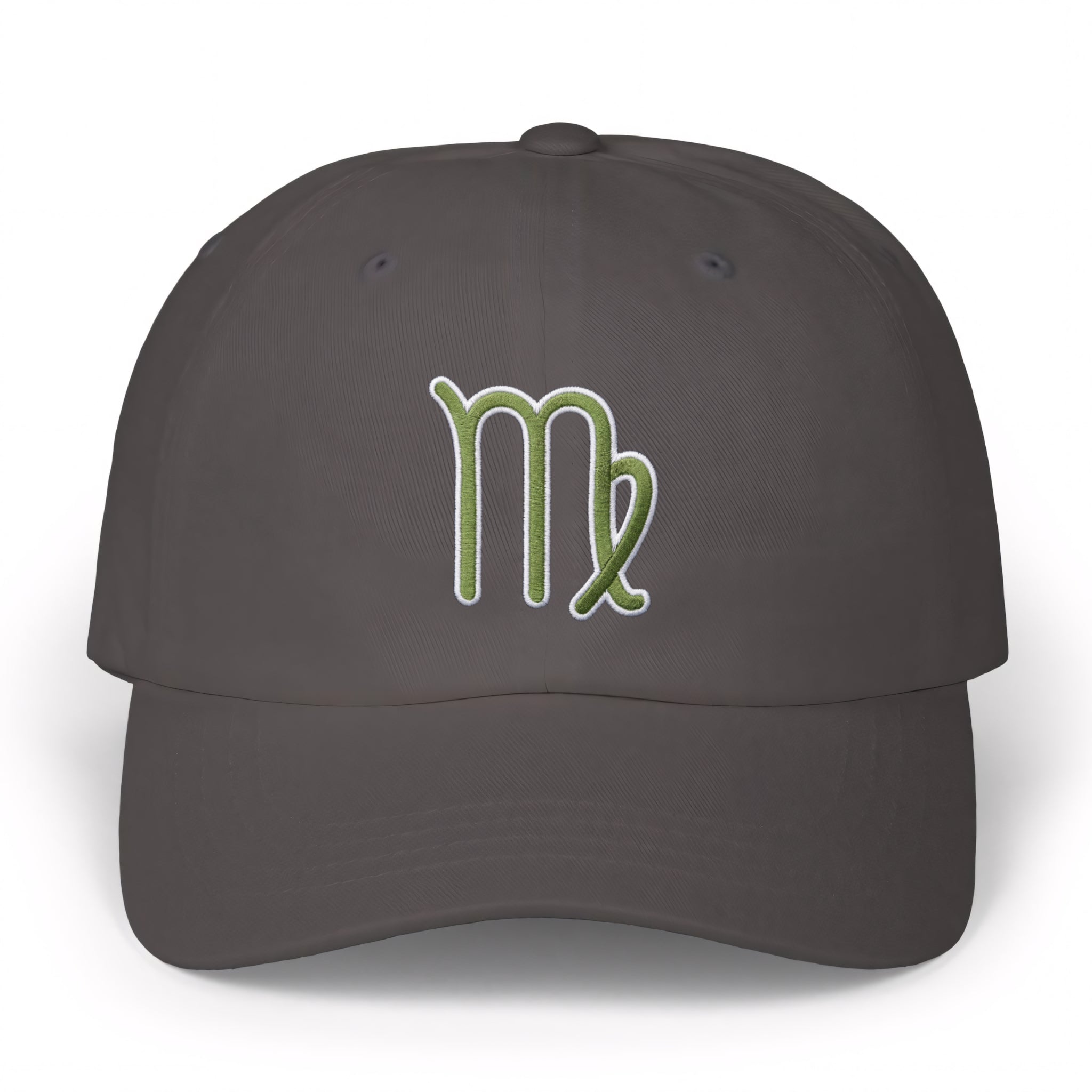This hat features a beautifully embroidered Virgo zodiac symbol (♍). The symbol is rendered in a vibrant green with a crisp white outline, giving it a fresh, natural, and earthy aesthetic. The Virgo symbol represents the earth sign known for its analytical, practical, and nurturing qualities, embodying traits like meticulousness, kindness, and a strong connection to nature and service. This design is perfect for those who proudly embrace their Virgo identity or appreciate astrological symbolism, offering a subtle yet meaningful way to express your personality.