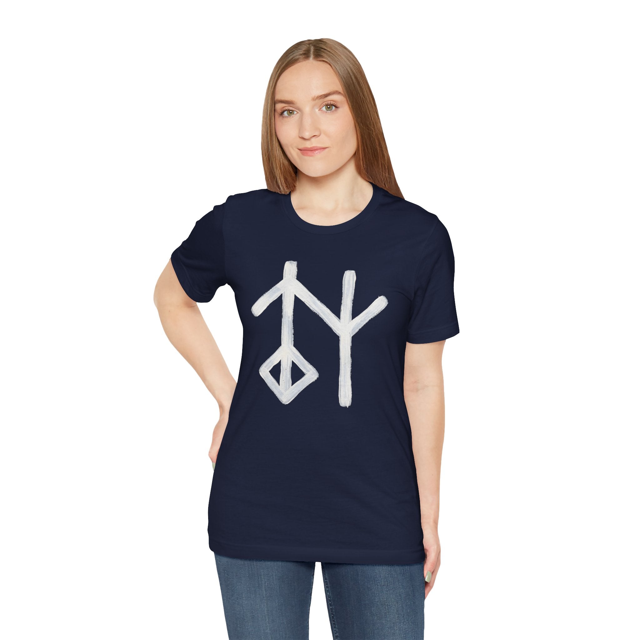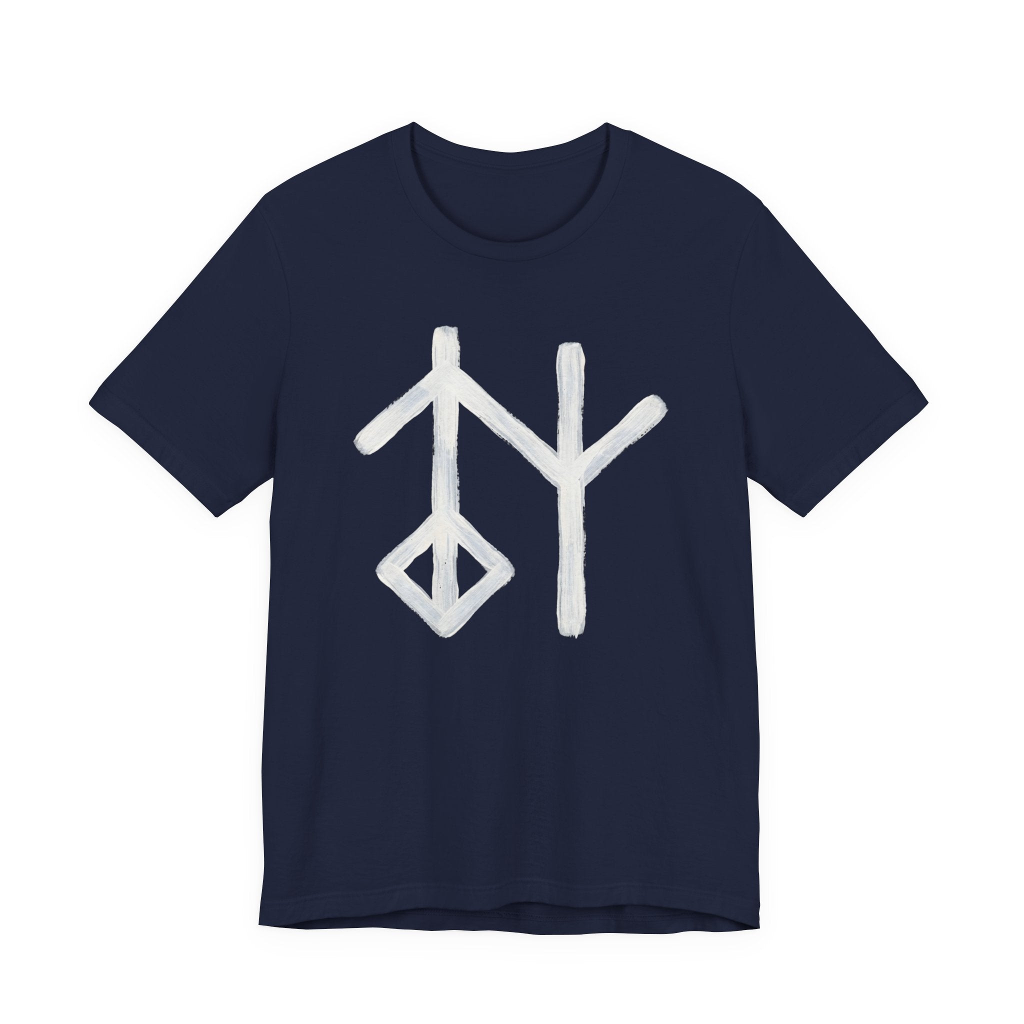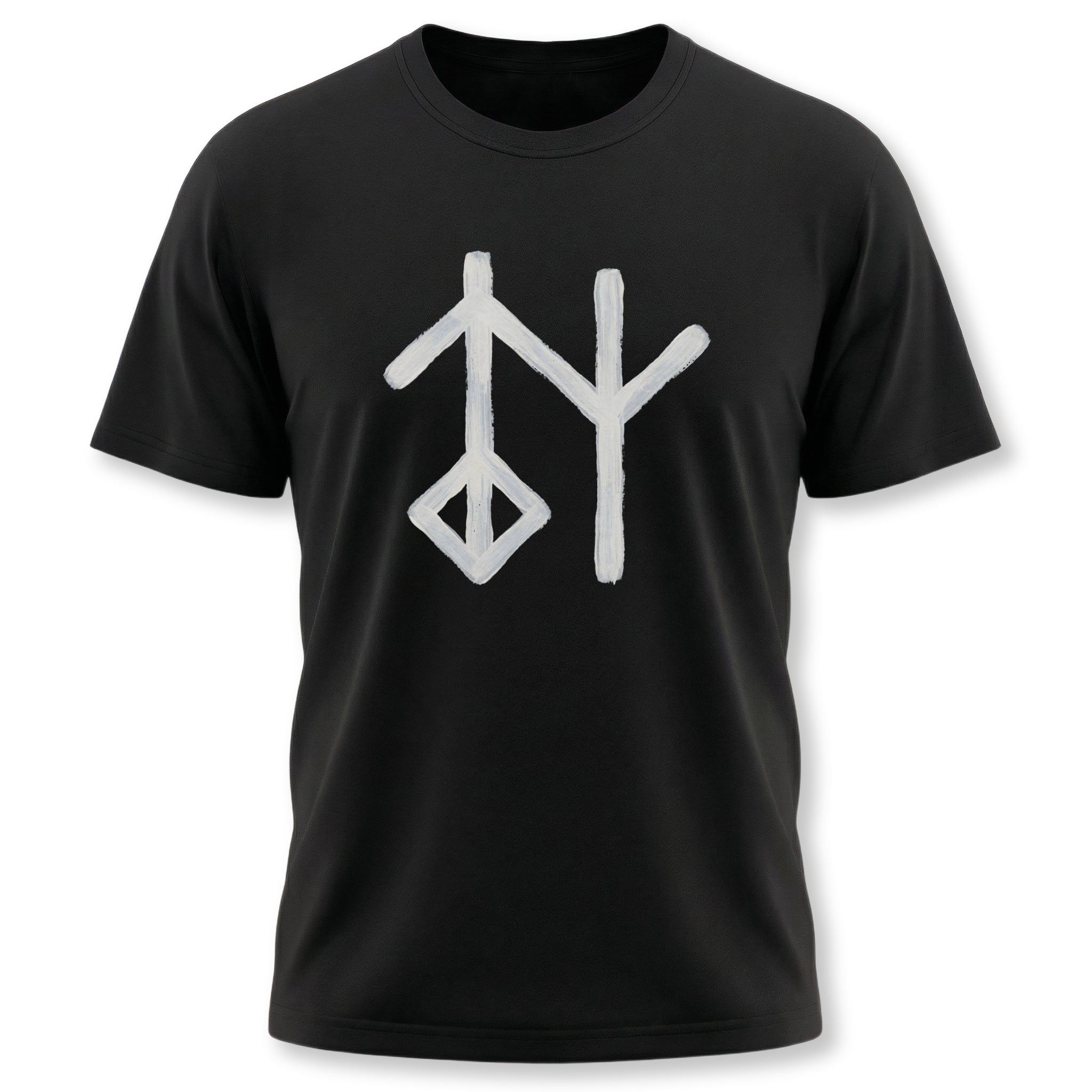 This t-shirt features a striking white graphic of the Wisdom Bind Rune, rendered with a distinctive, hand-drawn brushstroke aesthetic. This powerful bind rune is forged from ancient runic traditions, symbolizing deep knowledge, understanding, and enlightenment. It's a unique and thoughtful design for those who seek intellectual growth and appreciate profound symbolism, making it a compelling and meaningful statement piece.