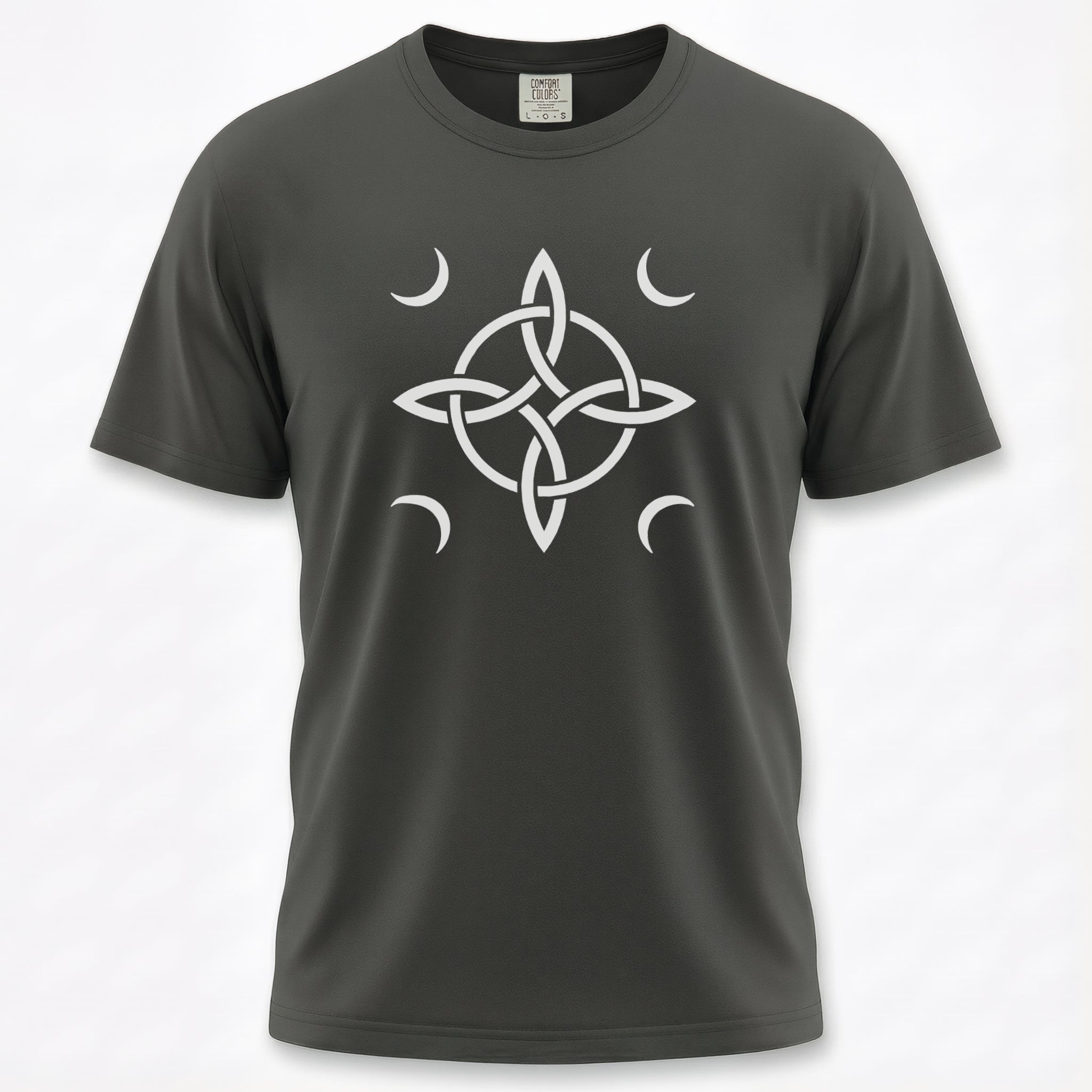 This t-shirt features an intricate white Witch's Knot at its center, beautifully encircled by four delicate crescent moons. The Witch's Knot is an ancient symbol renowned for its power of protection, binding negative energies, and warding off ill will. Complemented by the celestial crescent moons, symbols of intuition, cycles, and the divine feminine, this design evokes a deep sense of mysticism and spiritual safeguarding. It's a powerful graphic for those who appreciate ancient lore and seek a stylish emblem of protection and mystical connection.