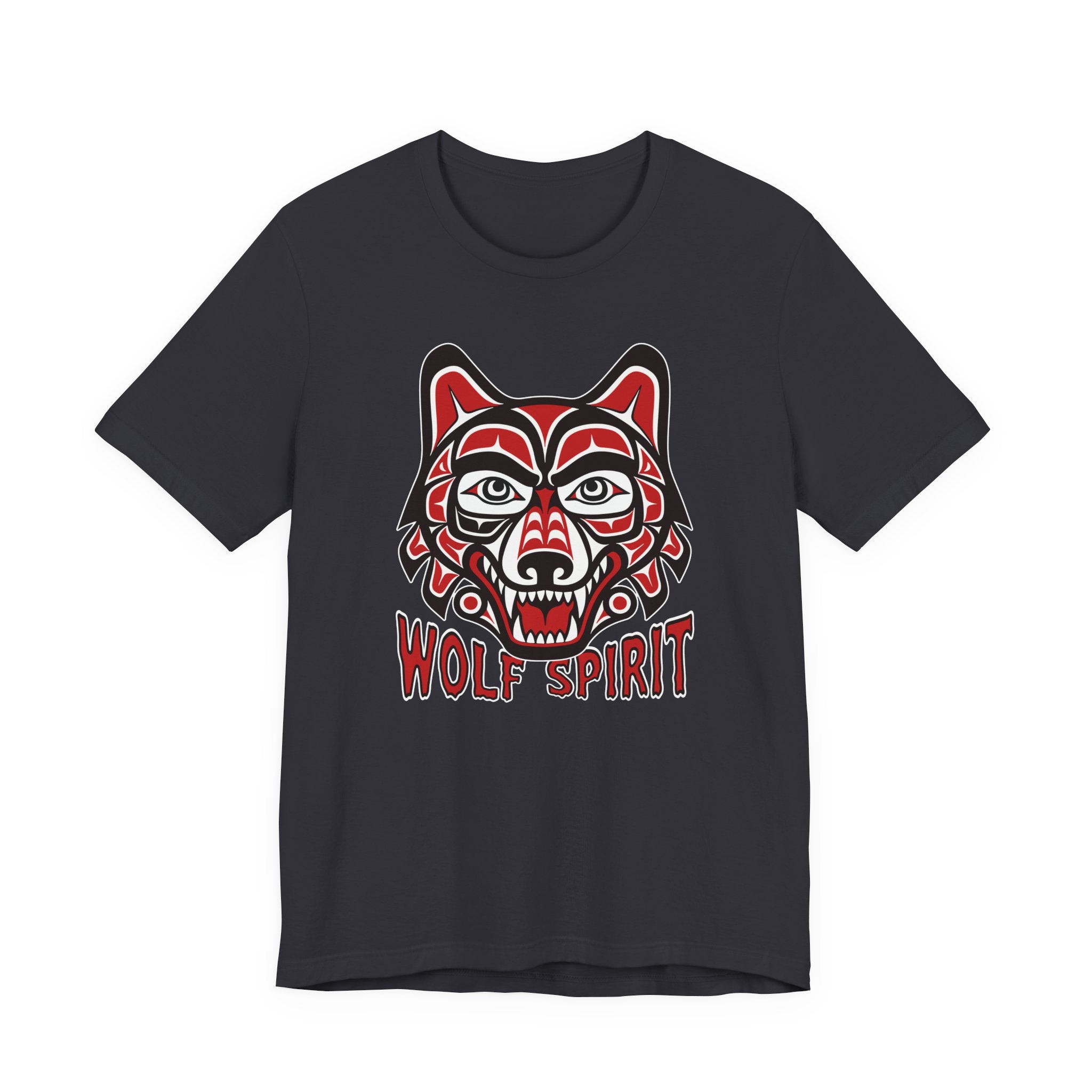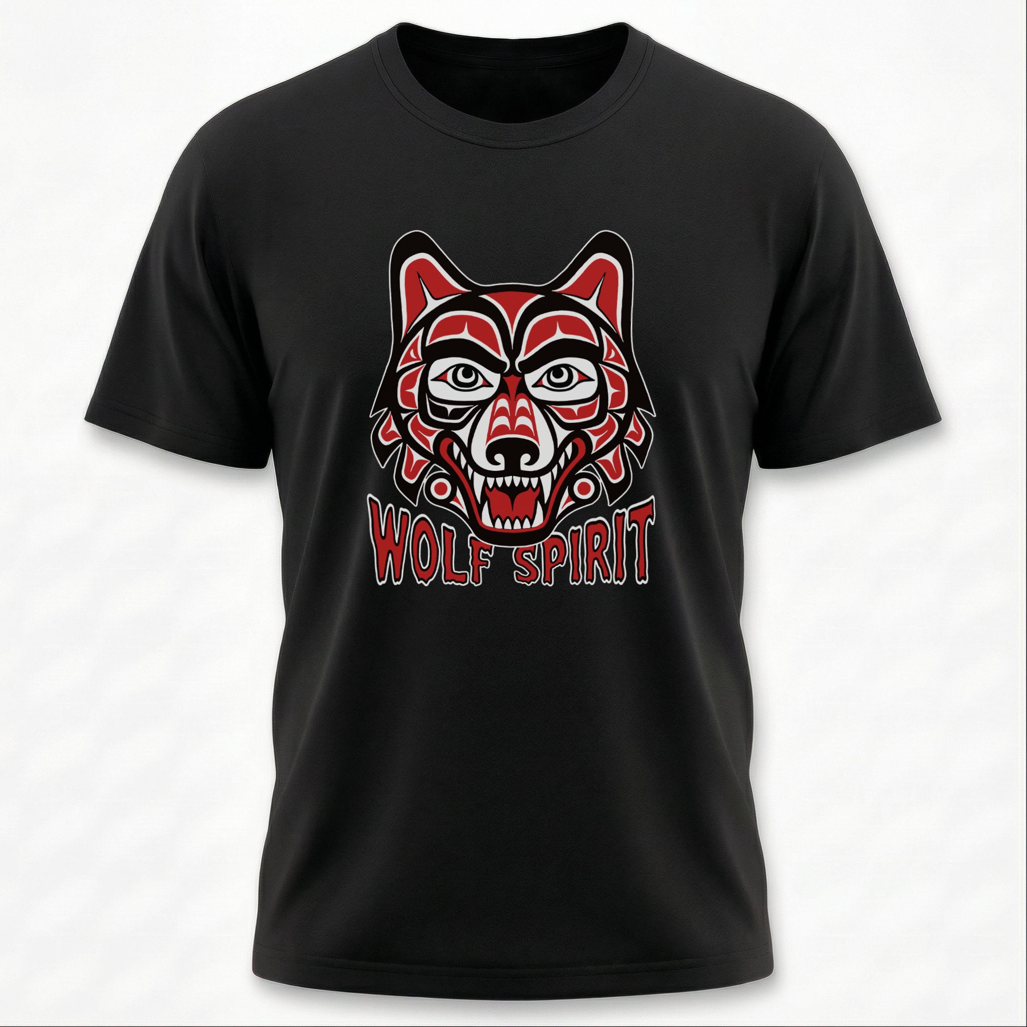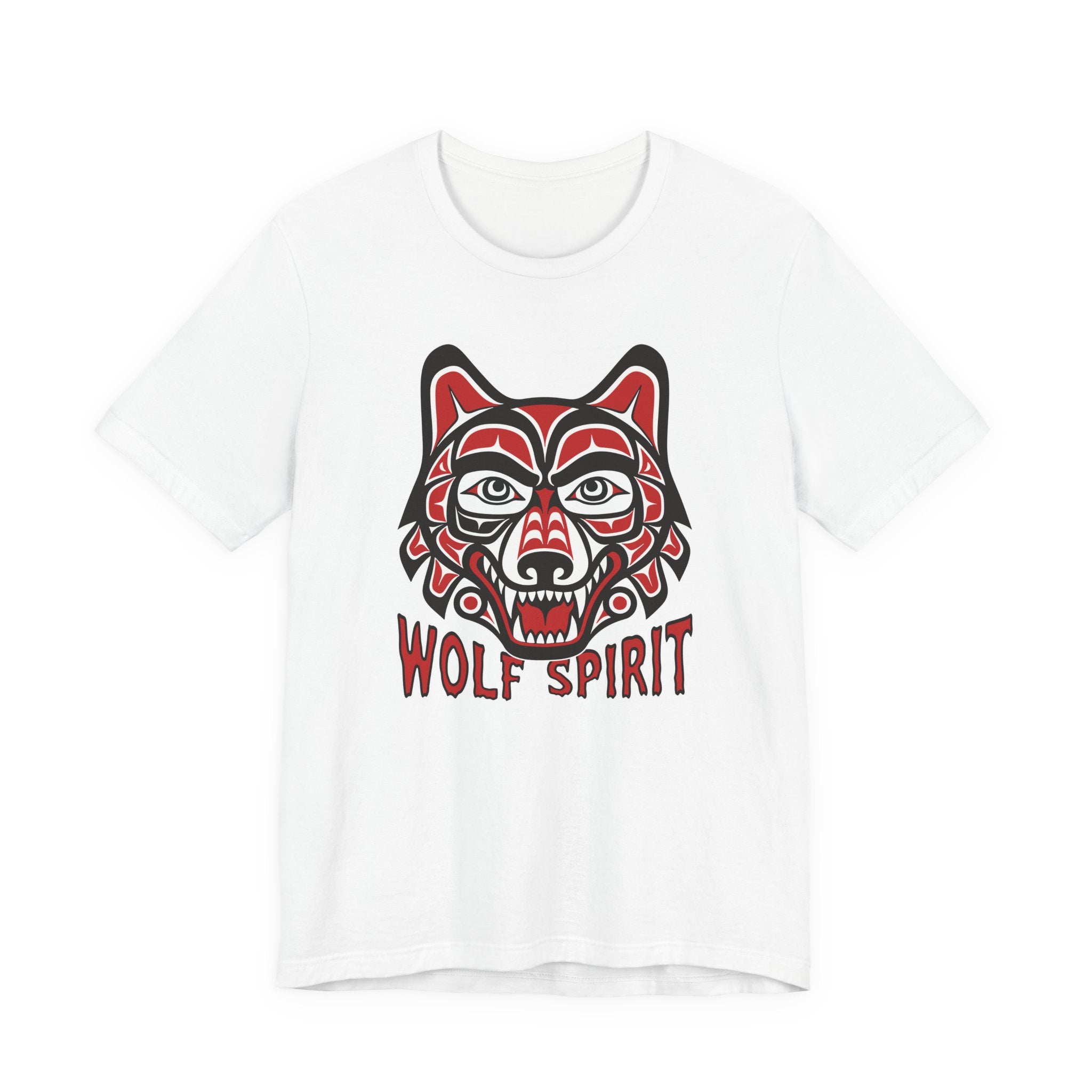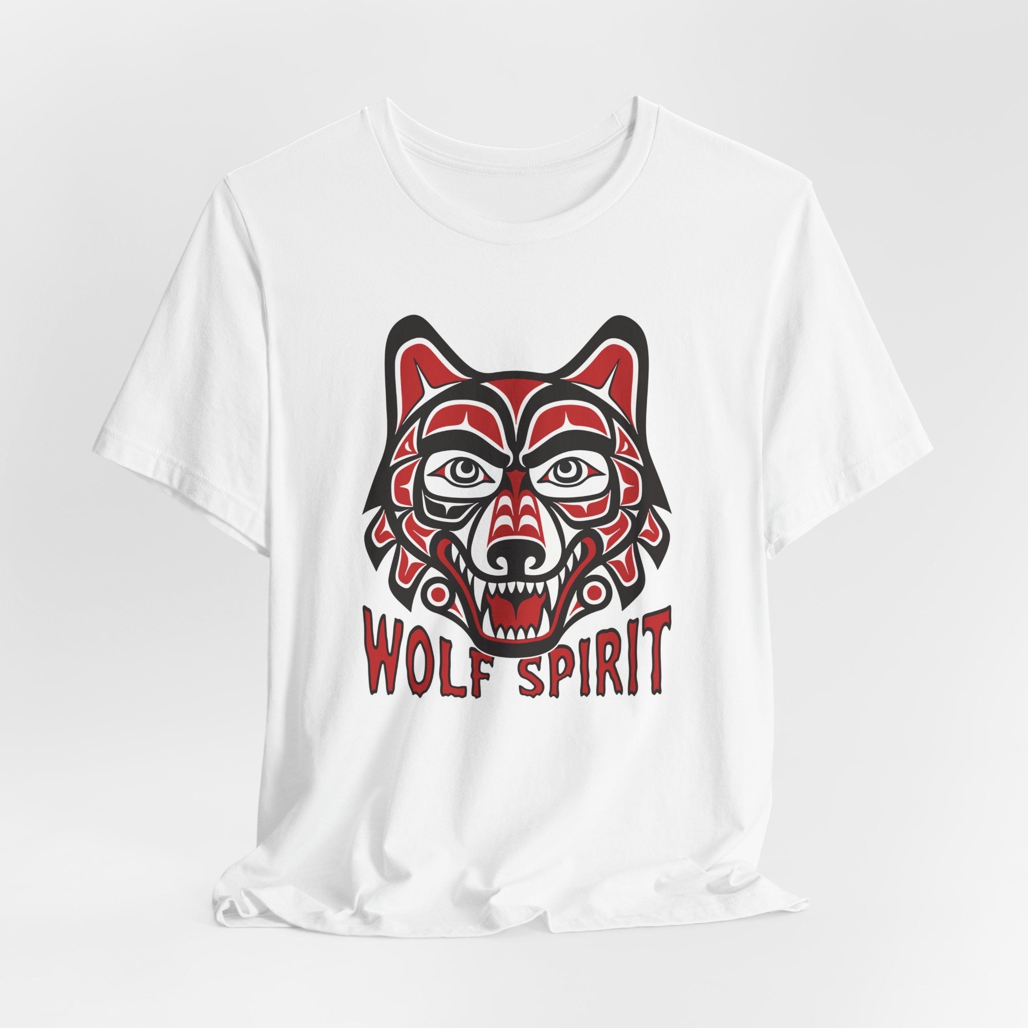 This t-shirt features a striking design of a wolf's head rendered in the distinctive formline art style, characterized by bold lines, ovoid shapes, and a vibrant red, black, and white color palette. Inspired by the rich traditions of Pacific Northwest Indigenous art, the wolf symbolizes loyalty, strength, intuition, and guardianship. The "Wolf Spirit" text reinforces the deep spiritual connection often associated with this powerful animal. This unique graphic is a powerful statement piece for those who resonate with the spirit of the wolf or appreciate culturally inspired art. Its intricate details and vibrant colors make it a captivating addition to any collection.