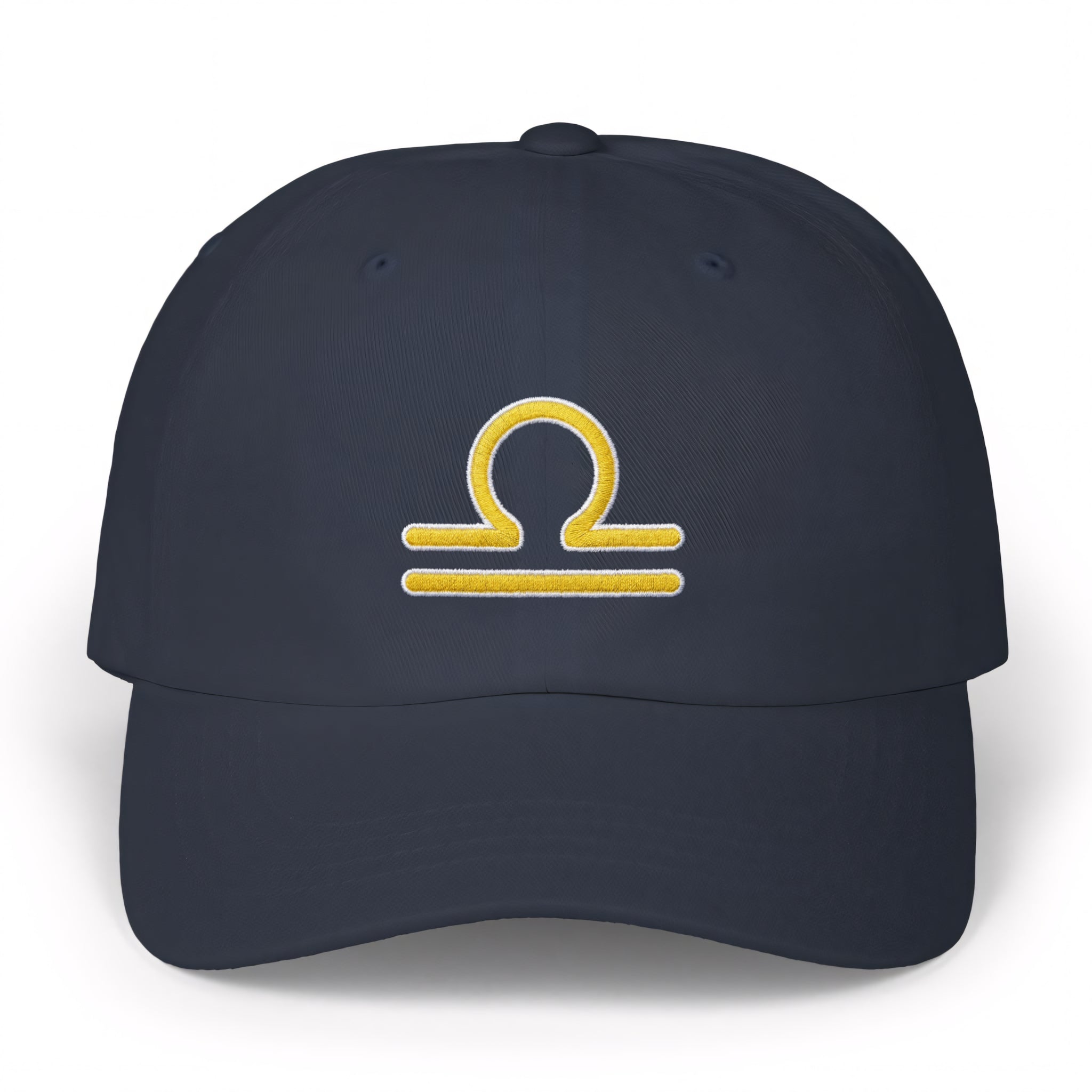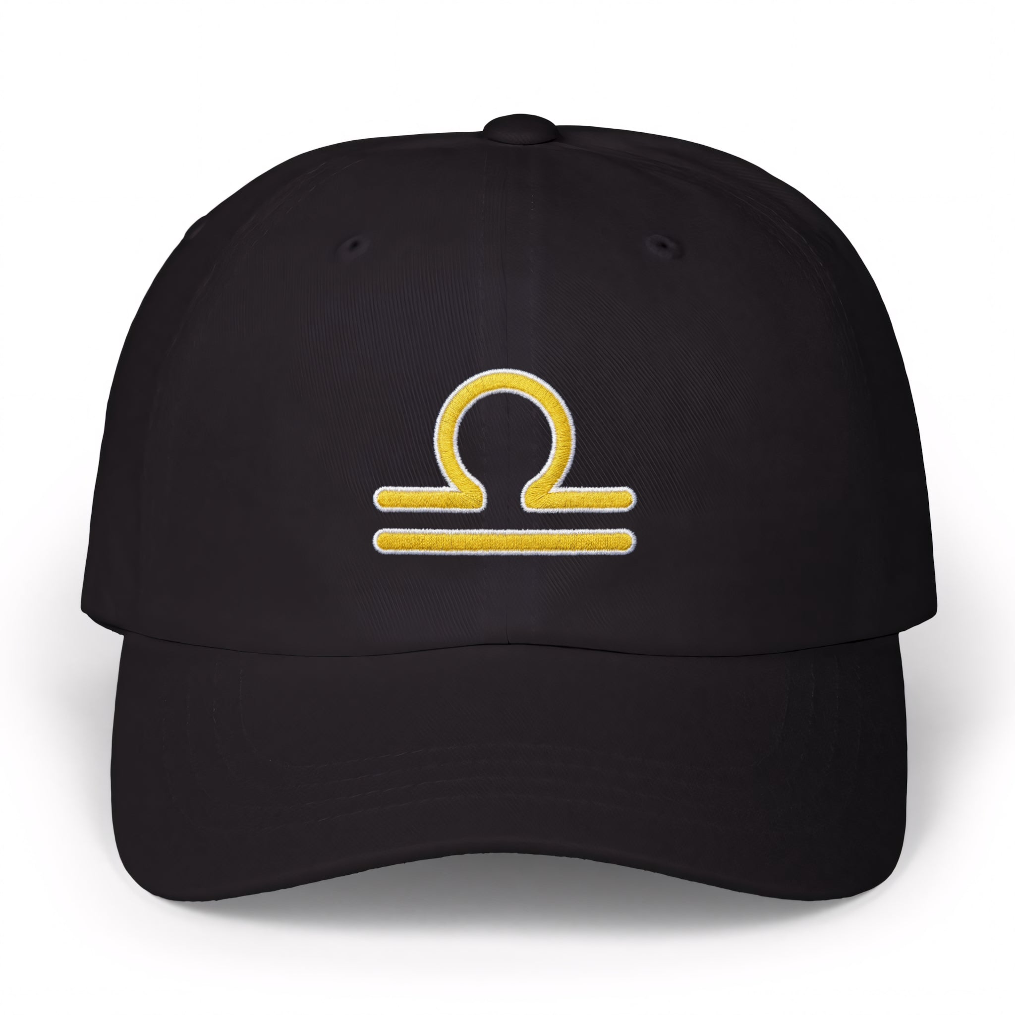 This hat features the iconic Libra zodiac symbol in a vibrant yellow embroidery with a crisp white outline, set against a classic black cap. The Libra symbol, represented by the scales, embodies balance, justice, harmony, and an appreciation for beauty and fairness. It's a subtle yet powerful tribute to the diplomatic and charming nature of those born under this air sign. This minimalist design is perfect for Libras or anyone who resonates with these qualities, adding a unique and personal touch to any outfit.