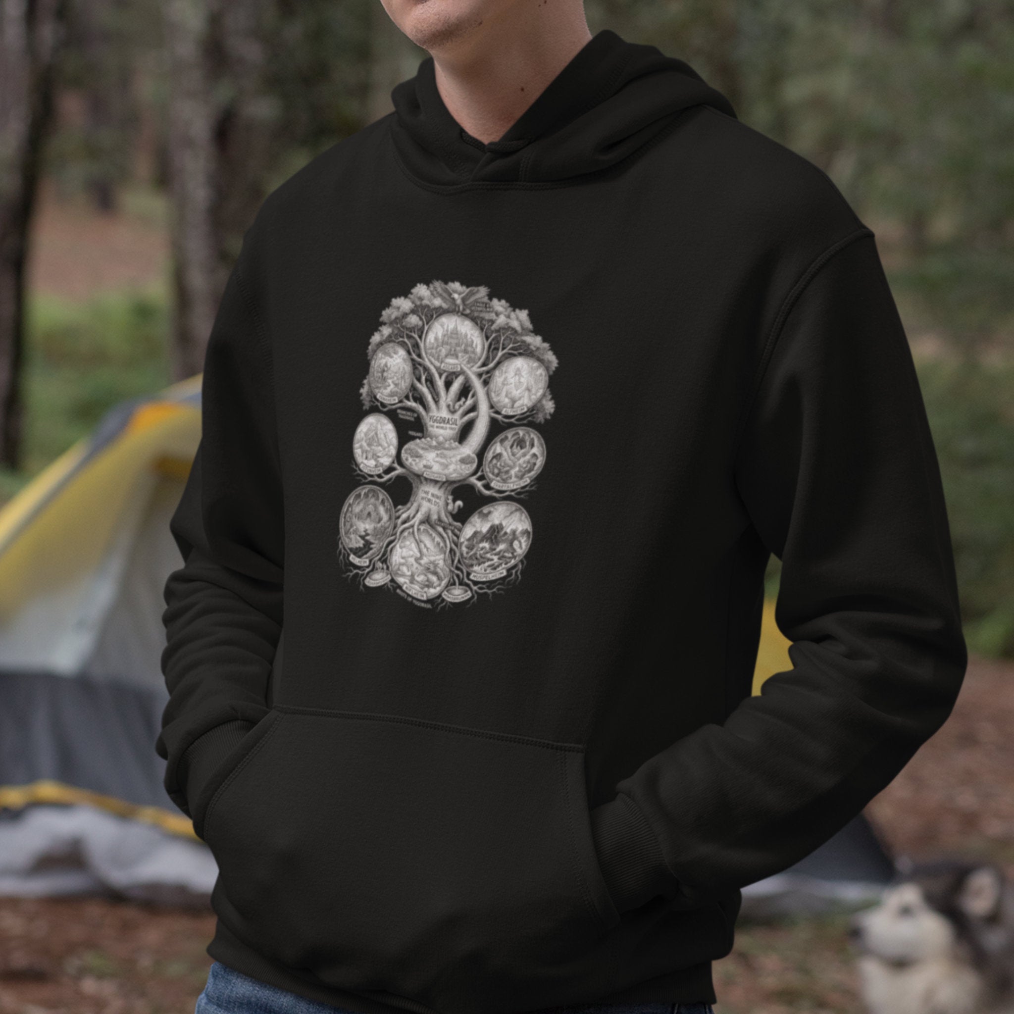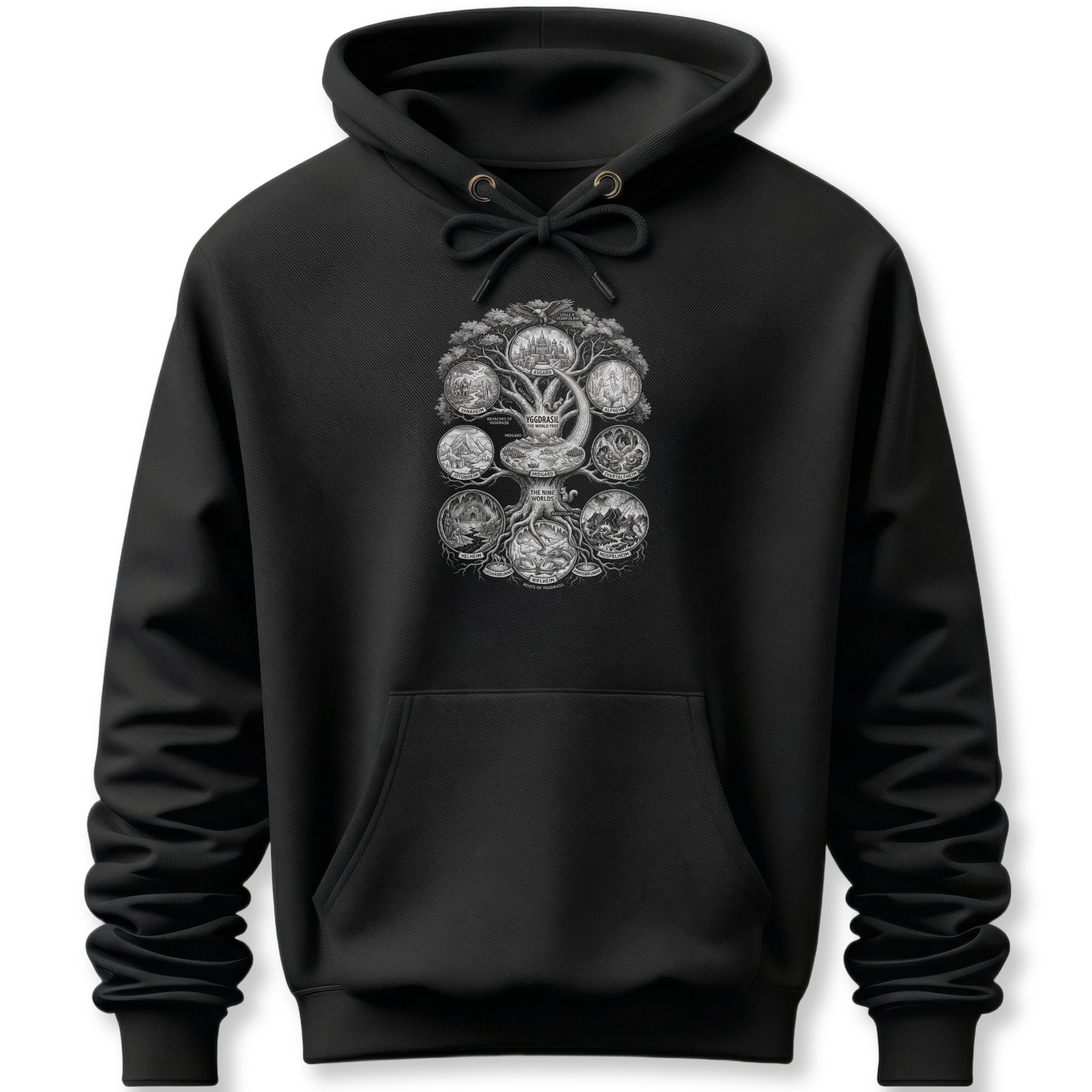 This hoodie showcases a beautifully intricate grayscale illustration of Yggdrasil, the sacred Norse World Tree. Surrounding its majestic branches and deep roots are nine detailed medallions, each vividly depicting one of the distinct realms it connects. Yggdrasil is central to Norse cosmology, representing the interconnectedness of all existence, life, death, and destiny. The Nine Worlds—from the heavenly Asgard to the human realm of Midgard and the underworld of Helheim—each tell a story of gods, giants, humans, and mystical beings, symbolizing the vast and complex tapestry of the cosmos. This unique graphic is perfect for enthusiasts of Norse mythology, fantasy, and intricate artistic symbolism. The detailed artwork makes it a powerful and educational statement piece, inviting contemplation and conversation.