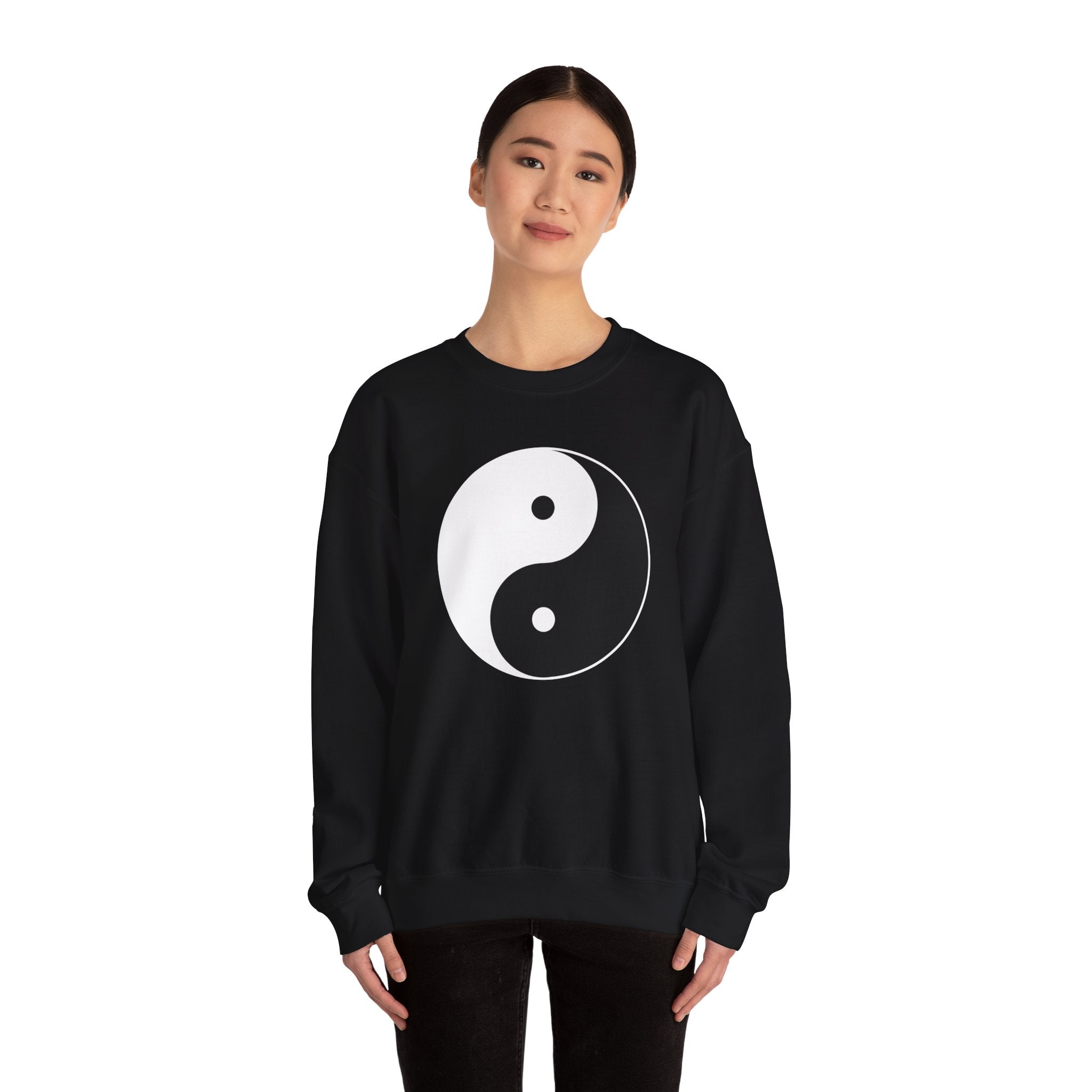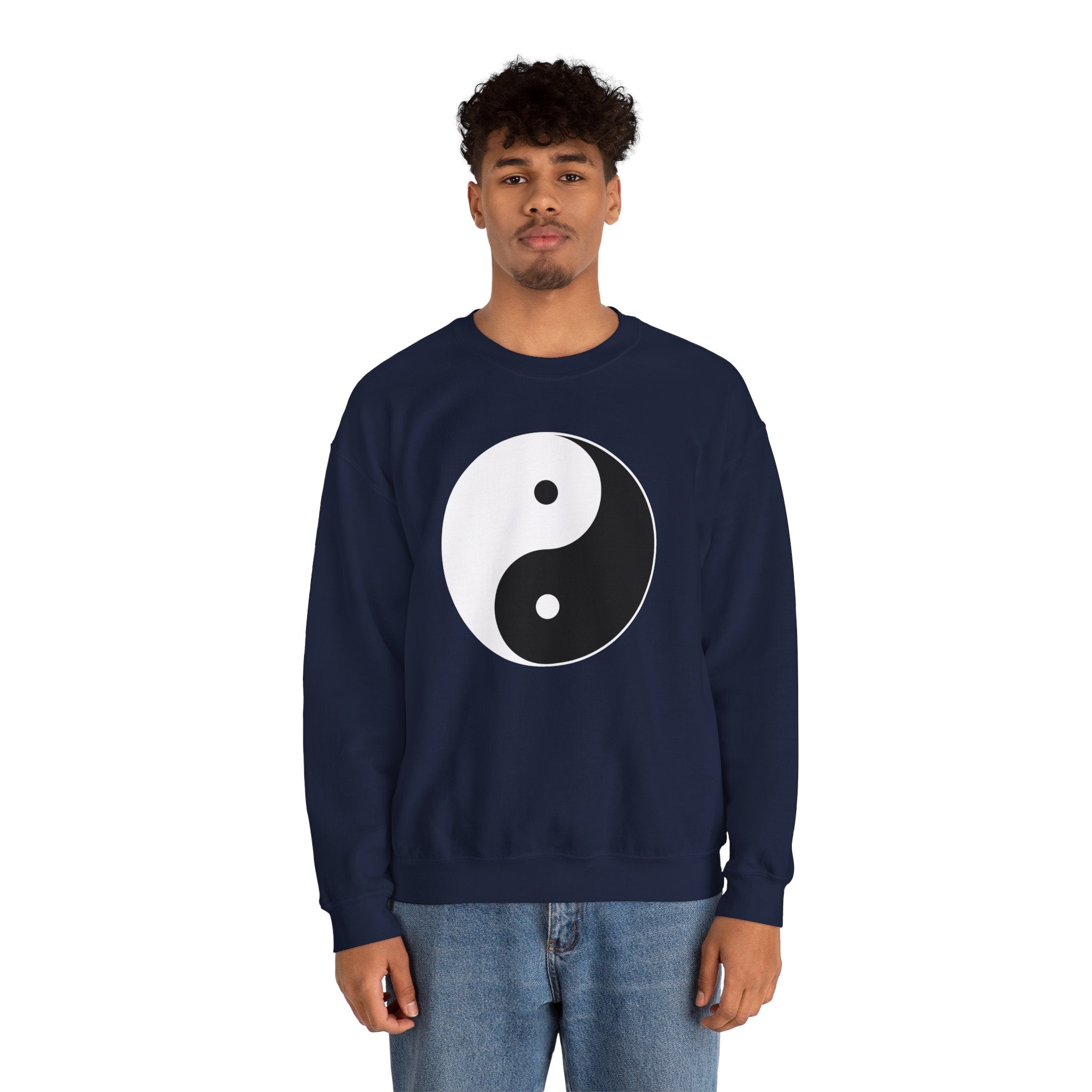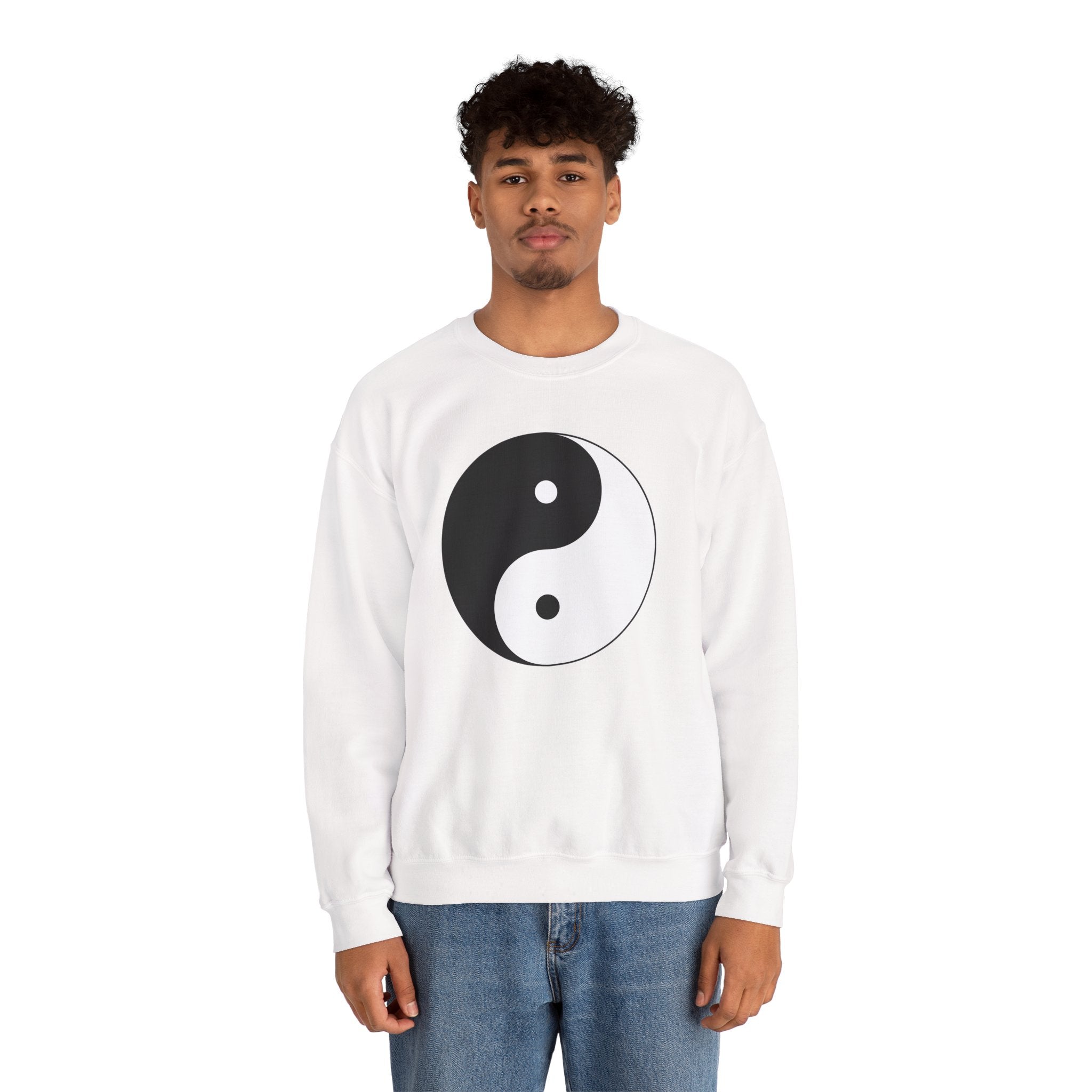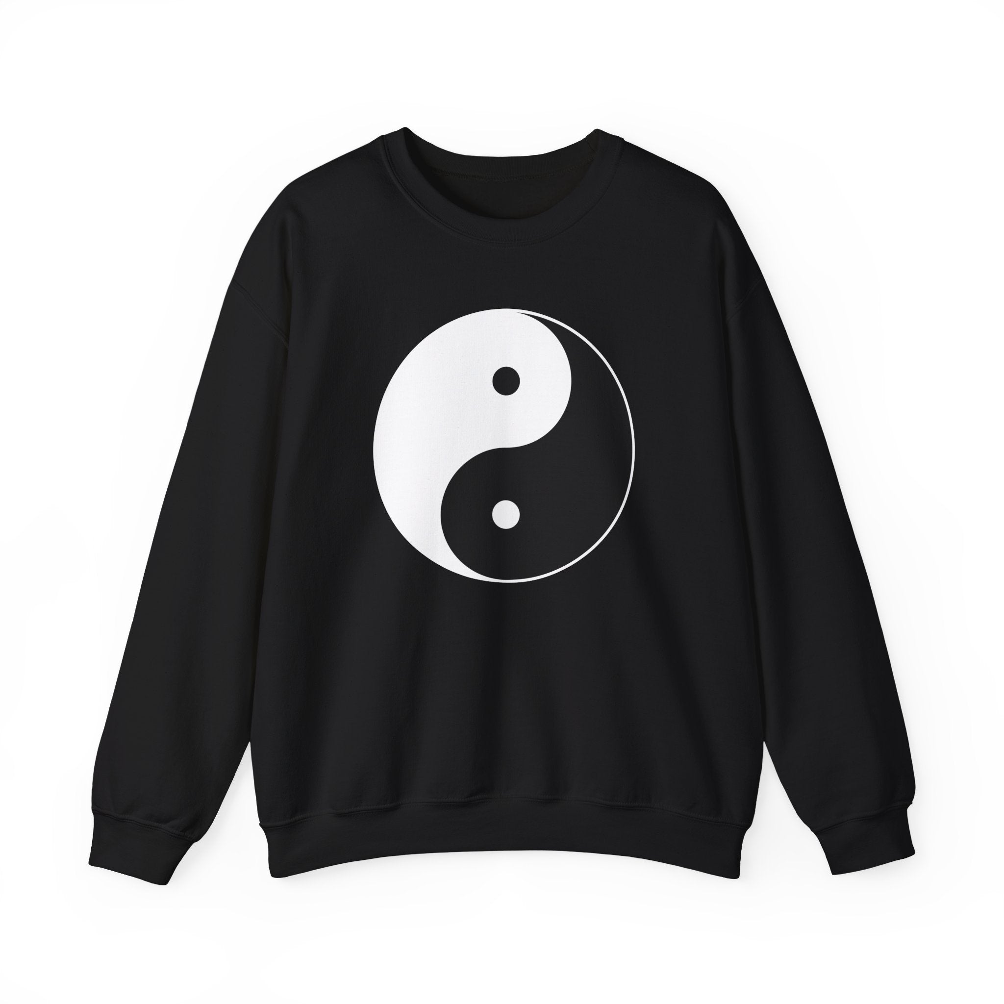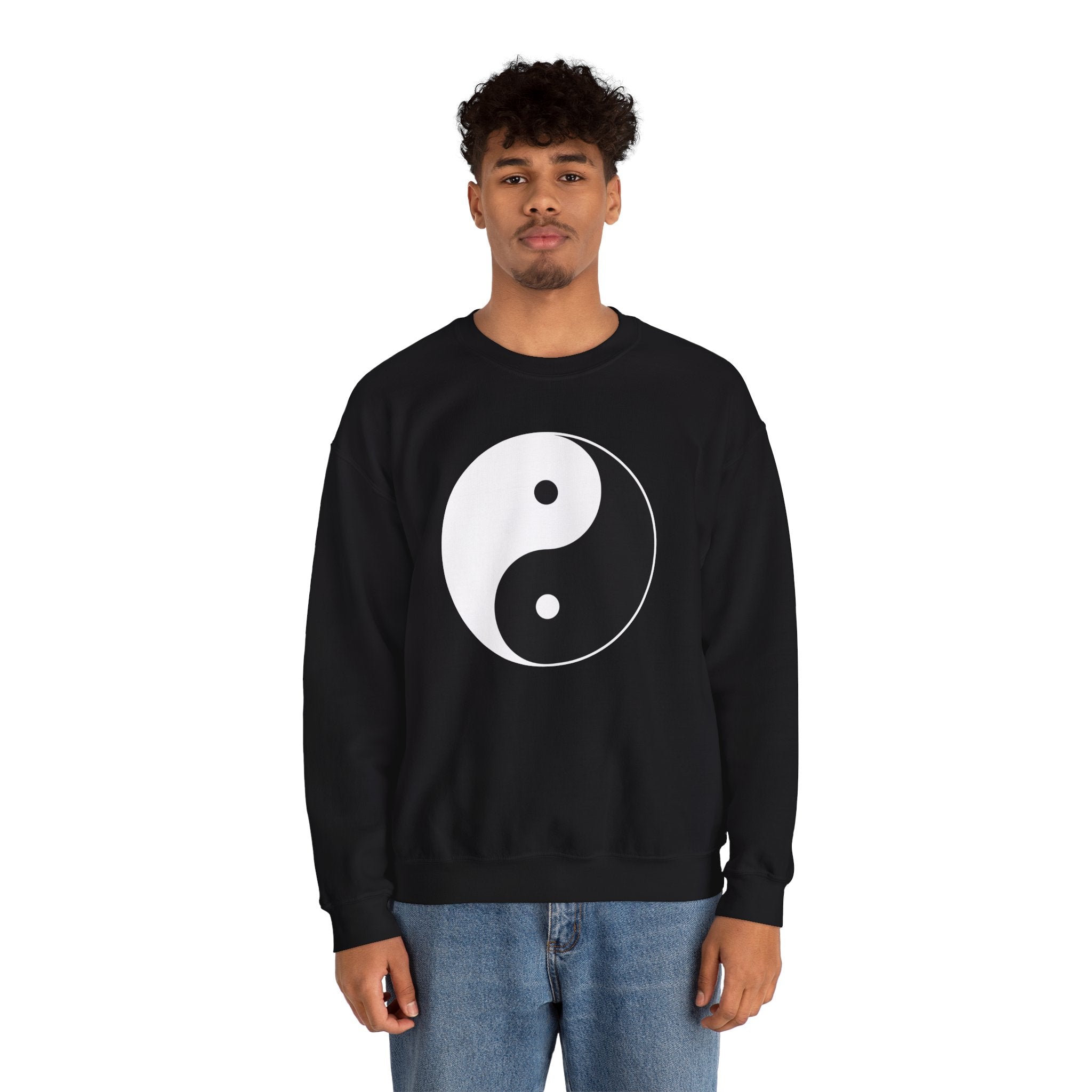 This sweatshirt showcases a classic, crisp white rendition of the iconic Yin-Yang symbol, boldly centered on a deep black background. Originating from ancient Chinese philosophy, the Yin-Yang represents duality, balance, and the interconnectedness of seemingly opposite forces, illustrating how they complement and give rise to each other. It's a profound and timeless graphic for those who appreciate harmony, philosophical symbolism, and a minimalist yet powerful aesthetic. This design is a versatile and thought-provoking statement piece for any wardrobe.