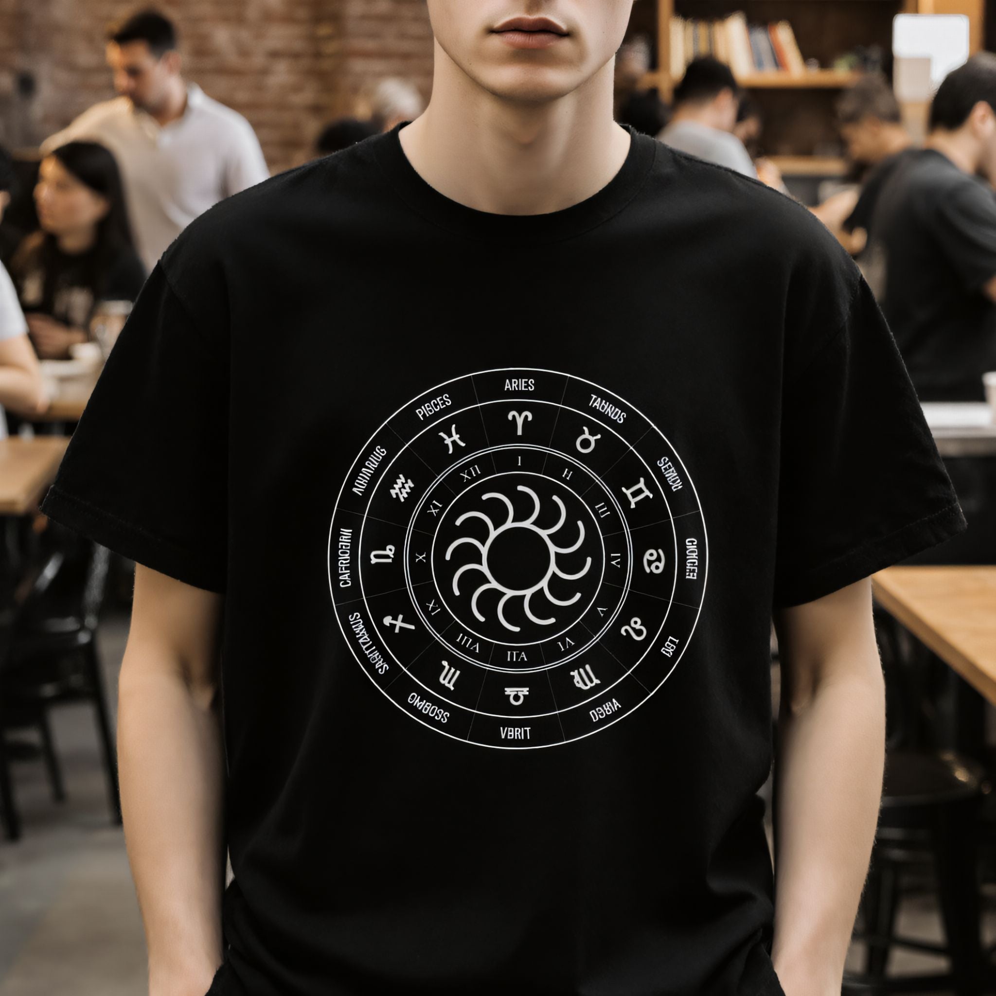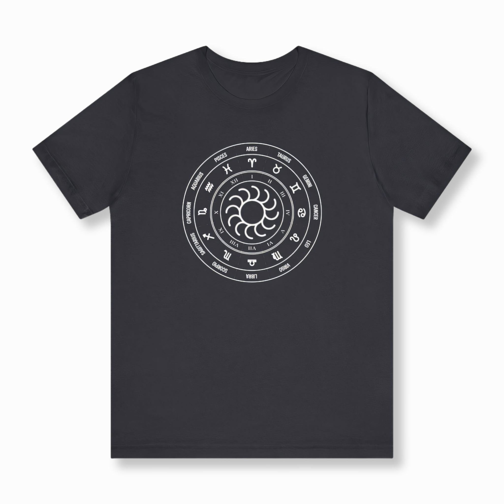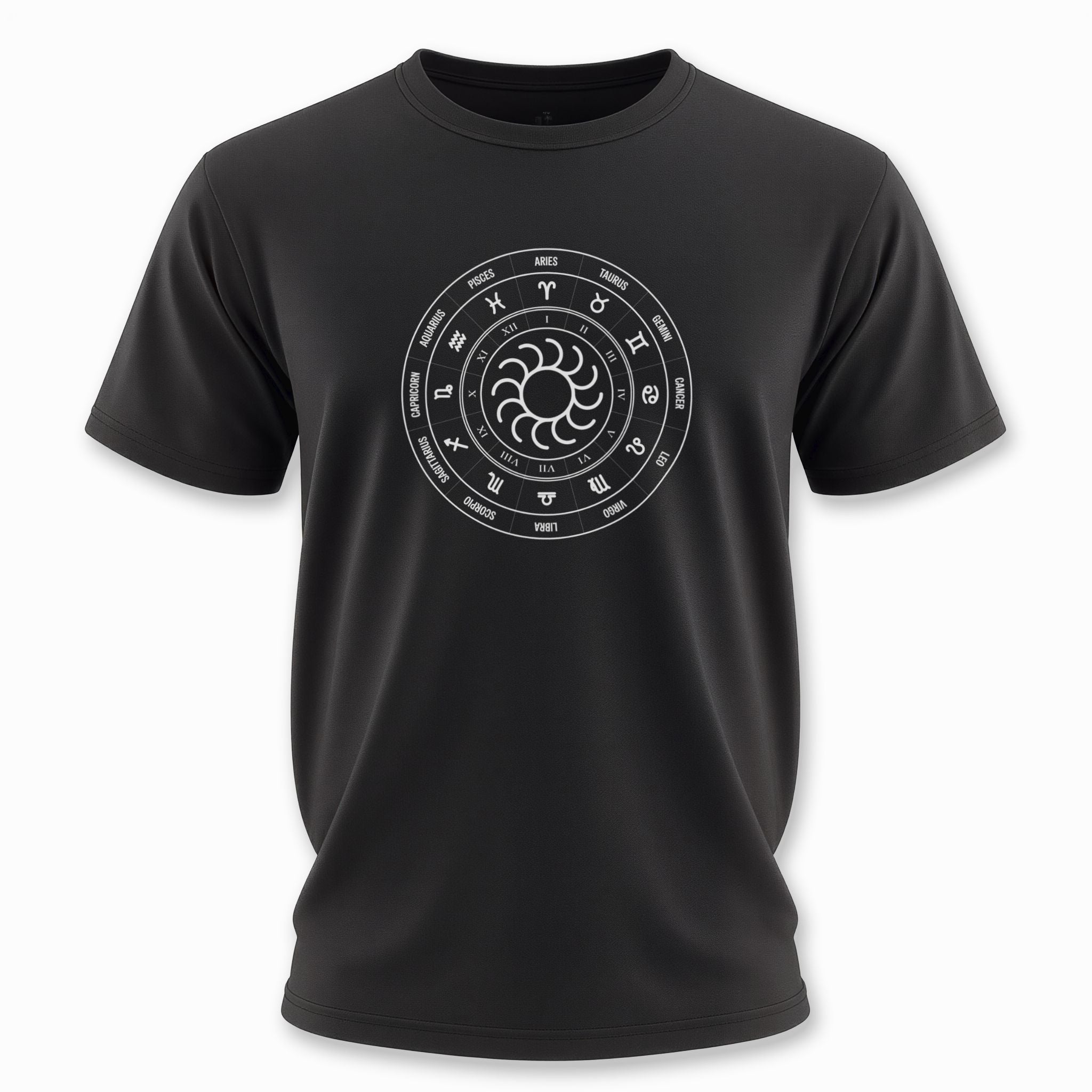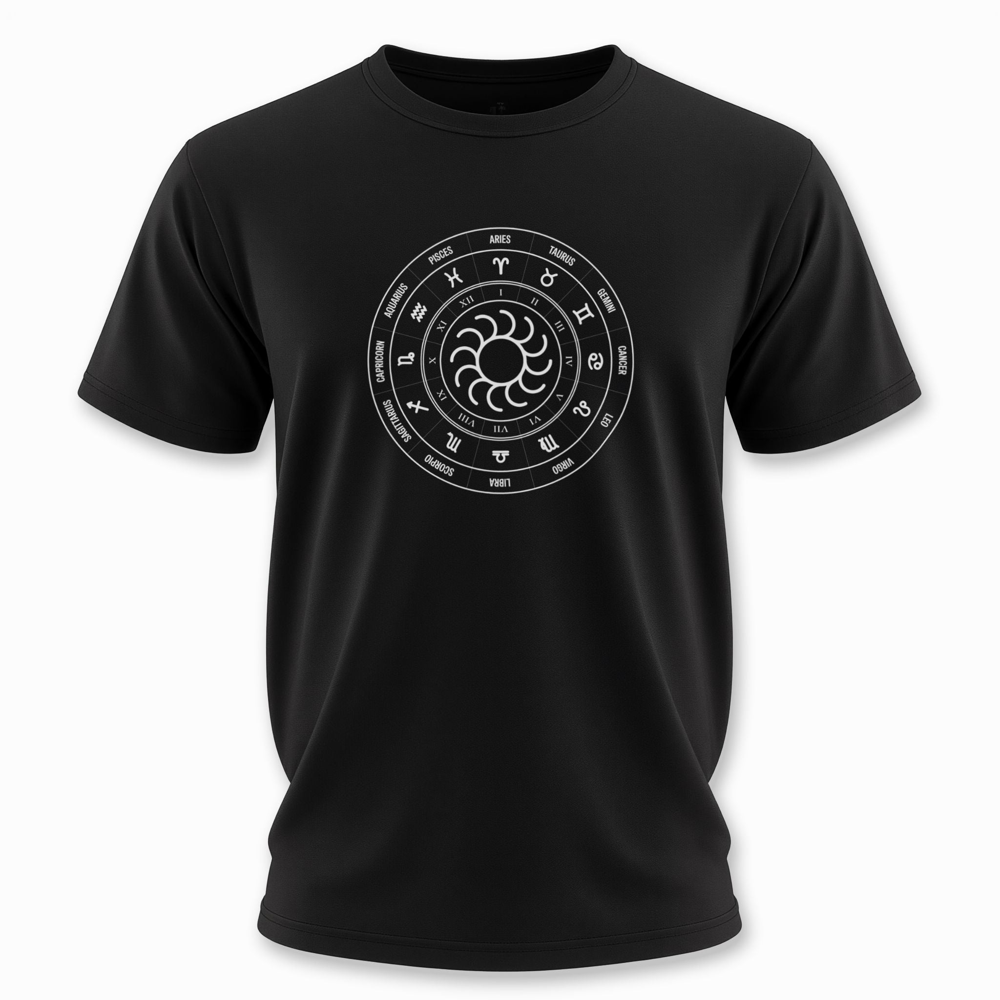 This t-shirt showcases an intricate white graphic of a classic Zodiac wheel set against a deep black background. The outer ring beautifully features all twelve astrological signs along with their corresponding names, while an inner ring displays Roman numerals, symbolizing the twelve houses or months of the year. At its core, a mesmerizing stylized sun-like symbol radiates energy, embodying life, consciousness, and the central force of the cosmos. The Zodiac wheel is a powerful ancient symbol, representing cosmic cycles, destiny, personality traits, and our profound connection to the universe. This unique and meaningful design is perfect for astrology enthusiasts, spiritual seekers, or anyone who appreciates celestial symbolism, making it a truly eye-catching and thought-provoking statement piece.
